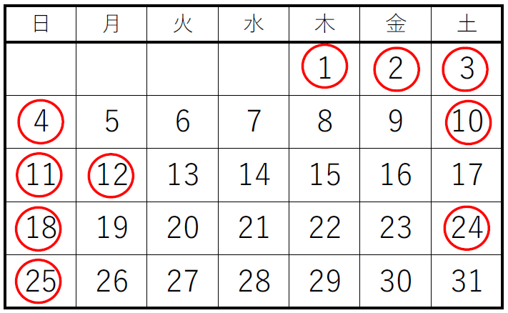 - 赤丸は休業日です。